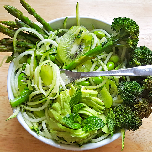 Dans deux grands bols, répartis tous tes fruits et légumes! Spaghettis de courgette, edamame, raisin, asperge, broccolini, kiwi, avocat et quelques feuilles de menthe! BOUM BADABOUM!